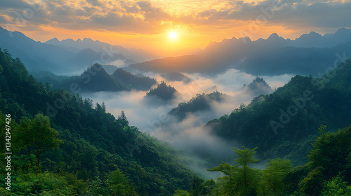 © AungThurein, Obraz premium A breathtaking sunrise casts golden hues over a misty mountain range with soft clouds drifting through the valleys