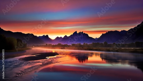 © FantasyLand86, Fototapeta premium A breathtaking sunrise over a majestic mountain range.