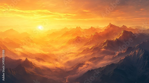 Naklejka premium A breathtaking sunrise over a mountain range, with the first light of day casting a golden glow on the peaks and mist swirling in the valleys below, creating a serene and majestic scene