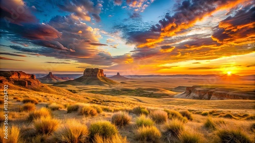 Fototapeta premium A breathtaking sunrise paints the desert landscape with vibrant hues, casting a golden glow on the mesas and the rolling grasslands.