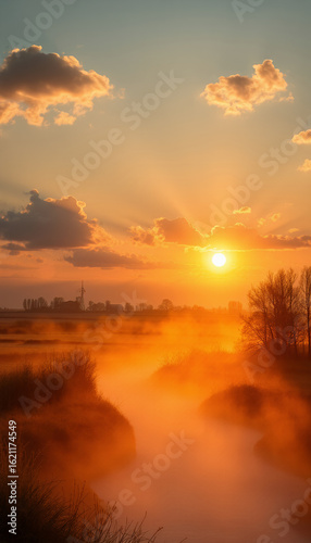 Obraz premium A breathtaking sunset casts a warm glow over a misty landscape, with a river...