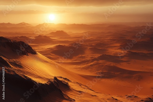 © Vibu design gallery, Naklejka premium A breathtaking sunset casts a warm golden hue over a vast, undulating desert landscape.