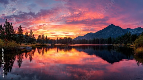 © Formoney, Fototapeta premium A breathtaking sunset casts brilliant hues across the sky and reflects on a calm lake surrounded by pine trees and mountain peaks. The serene setting invites peace and contemplation.