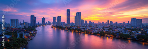 Fototapeta premium A breathtaking sunset casts vibrant colors over the Chao Phraya River, highlighting the skyline of Bangkok's modern skyscrapers