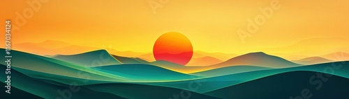 © pingpao, Obraz premium A breathtaking sunset illuminating rolling hills, creating a peaceful and serene atmosphere in vibrant colors.