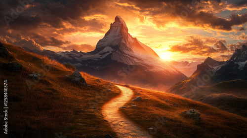 Fototapeta premium A breathtaking sunset over a mountain, with a winding trail leading up its...