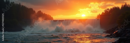 Fototapeta premium A breathtaking sunset over a waterfall, surrounded by lush forests, capturing...