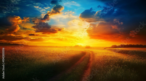 © GoldPumaze, Obraz premium A breathtaking sunset over golden fields, casting a warm glow and painting the sky with vibrant colors.