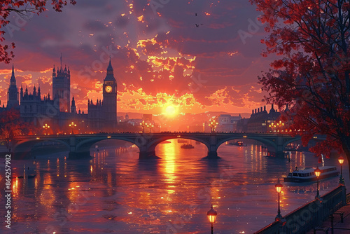 Fototapeta premium A breathtaking sunset over London, highlighting iconic landmarks like Big Ben...