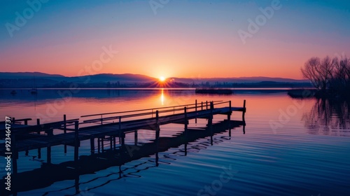 Naklejka premium A breathtaking sunset view over a serene lake, featuring a wooden pier...