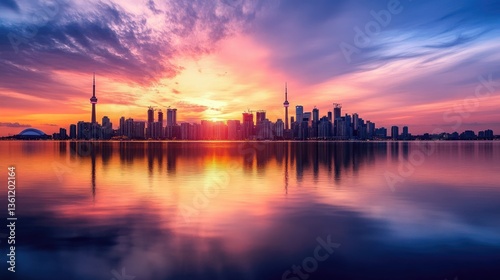 Naklejka premium A breathtaking sunset view with a city skyline reflected in the serene waters...