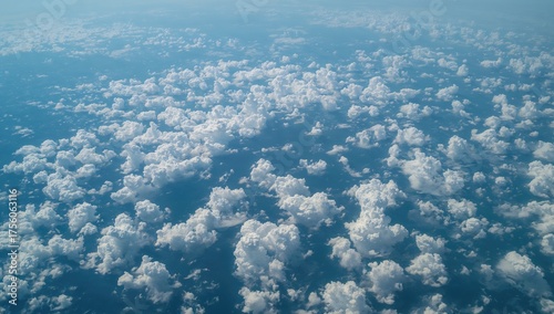 Obraz premium A breathtaking top-down perspective of the sea featuring an extensive spread of soft white clouds dotting the area, providing a striking contrast to the rich blue ocean below.