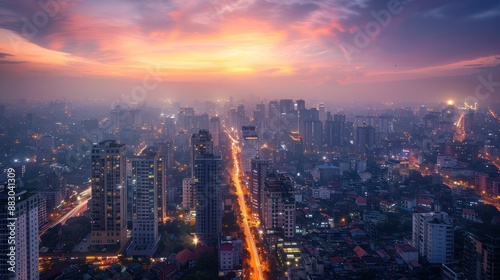 © Thanyaporn, Fototapeta premium A breathtaking top view of a sprawling urban cityscape during the evening. The skyline is dotted with tall buildings, their windows aglow with lights. The streets below are alive with the movement of