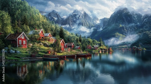 © imlane, Fototapeta premium A breathtaking, ultra-realistic view of a picturesque Norwegian village nestled between lush green forests and towering misty mountains.