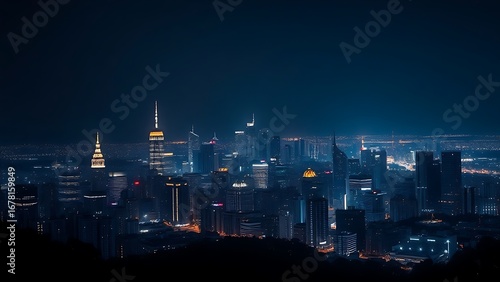 © cheng, Fototapeta premium A breathtaking urban skyline illuminated by city lights under a gradient night sky.