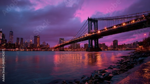 Fototapeta premium A breathtaking view of a bridge over a river at dusk, with the city skyline illuminated in the distance. The bridge spans the water, reflecting the vibrant colors of the sky