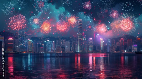 Naklejka premium A breathtaking view of a city skyline lit up by vibrant fireworks, reflecting beautifully on the water below. The scene captures the excitement and energy of a festive night in the city.