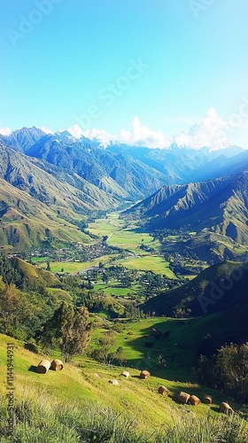 © MetaKibo, Obraz premium A breathtaking view of a lush valley surrounded by mountains under a clear sky.