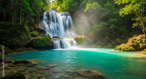 Fototapeta premium A breathtaking view of a majestic waterfall cascading into a turquoise pool,...