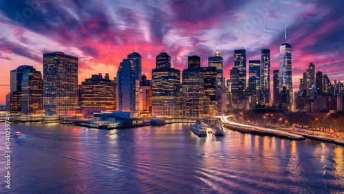 © Rony, Fototapeta premium A breathtaking view of a modern city skyline at sunset, with vibrant colors painting the sky and reflecting on the river below