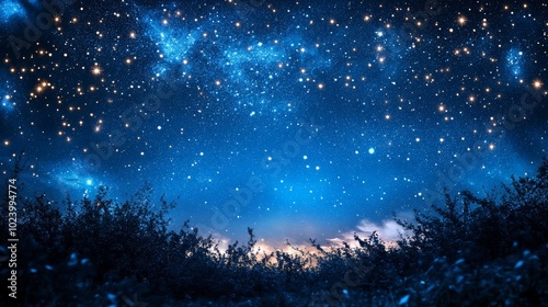 Naklejka premium A breathtaking view of a starry night sky filled with twinkling stars and deep blue tones above a serene landscape