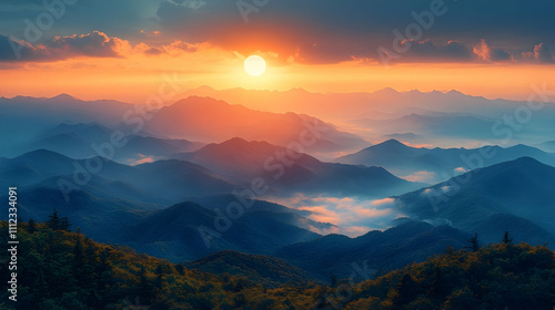 Fototapeta premium A breathtaking view of a sunrise casting warm hues over misty mountain layers in a tranquil atmosphere