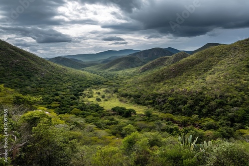 © Marcos Kulenkampff, Fototapeta premium A breathtaking view of a verdant valley surrounded by mountains under a moody sky.