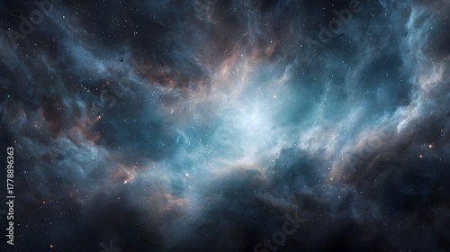 © Bussakon, Fototapeta premium A breathtaking view of a vibrant cosmic nebula featuring a luminous core swirling gas clouds and distant stars in deep space