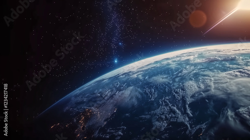 © pasakorn, Obraz premium A breathtaking view of Earth from space, glowing sunrise on the