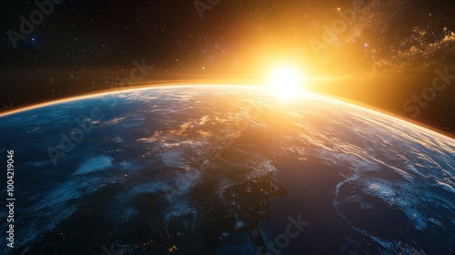 Obraz premium A breathtaking view of Earth from space, showcasing a serene sunrise over the...