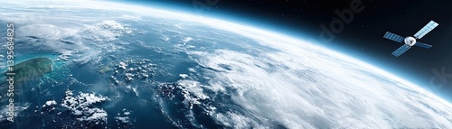 © watcharee, Fototapeta premium A breathtaking view of Earth from space, showcasing its blue oceans, white clouds, and a satellite orbiting above.