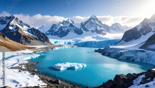 Naklejka premium A breathtaking view of icy mountains and a turquoise glacial lake under a...