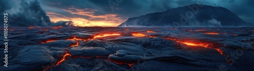 Naklejka premium A breathtaking view of molten lava flowing across a dark landscape under a colorful sunset, highlighting the beauty of nature's power.