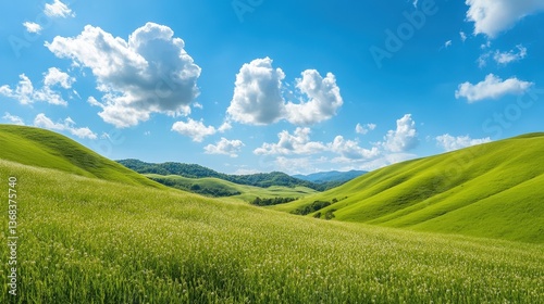 © wicha, Fototapeta premium A breathtaking view of rolling grass-covered hills under a bright blue sky.