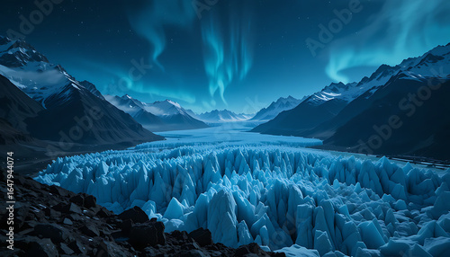 Fototapeta premium A breathtaking view of the aurora borealis illuminating the night sky above a vast, frozen glacier surrounded by snowcapped mountains, creating a magical and serene winter landscape