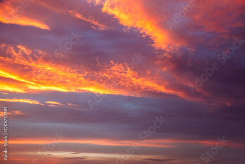 © Leonid Tit, Fototapeta premium A breathtaking view of the evening sky with clouds shining red-orange shades.
