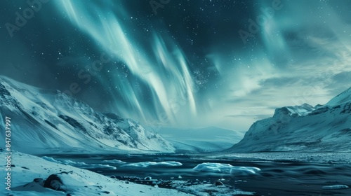 Fototapeta premium A breathtaking view of the Northern Lights shimmering over a snowy Icelandic...