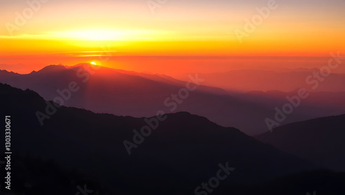 © SMURFFYx, Fototapeta premium a breathtaking view of the sunset over a mountain range, casting long shadows
