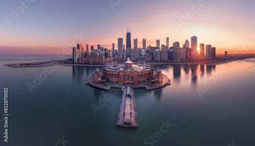 Fototapeta premium A breathtaking vista of Navy Pier on Lake Michigan, with Chicago's city skyscrapers in warm dawn