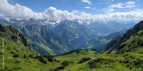 © AndiAzis, Fototapeta premium A breathtaking vista unfolds across a verdant mountain valley, with majestic peaks rising towards a sky adorned with fluffy white clouds, creating a serene and awe-inspiring natural landscape.