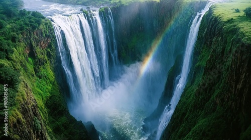 Fototapeta premium A breathtaking waterfall scene with lush greenery and a rainbow in the mist.