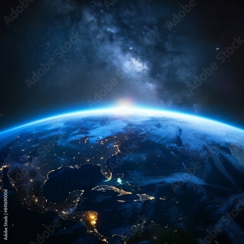 Fototapeta premium A breathtaking wide-angle view of Earth from space, showcasing the eastern coast of North America bathed in the glow of city lights against a backdrop of the Milky Way.
