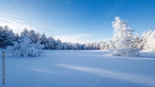 © Generative AI, Obraz premium A breathtaking winter landscape featuring snowcovered trees against a bright blue sky : Generative AI