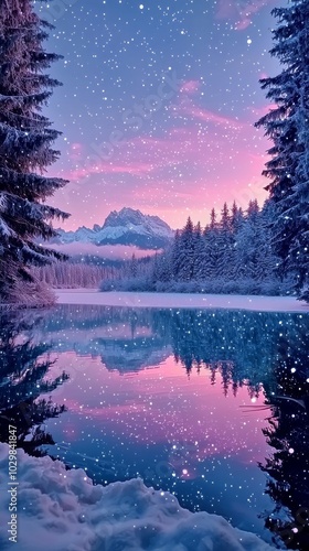 © Koja, Fototapeta premium A breathtaking wintry landscape where a snowy forest with distant mountains reflects perfectly in a calm lake at dusk, creating a mirror image perfect in every detail.