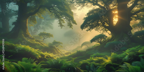 © Feel Surreal, Fototapeta premium A breathtakingly beautiful nature background featuring a majestic, serene, and intriguing scene that exudes tranquility, with lush greenery, towering trees, created by generative ai