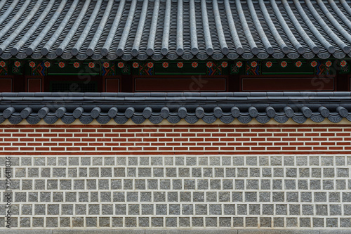 Obraz premium A brick wall and roof of Gyeongbokgung Palace, South Korea