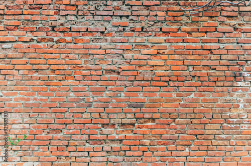 © Алла Морозова, Naklejka premium A brick wall with a few holes in it. The wall is red and has a rough texture