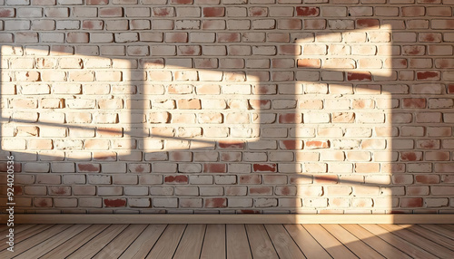 Obraz premium A brick wall with a wooden floor in the foreground, with shadows cast on the wall from an unseen light source