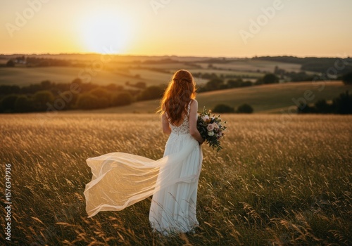 © Maksim, Naklejka premium A bride in a flowing white dress with red hair stands in a golden field at sunset, looking out over rolling hills, creating a romantic and ethereal scene.