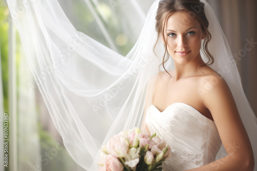 © iDoPixBox, Naklejka premium A bride is standing in front of a window with a veil on her head